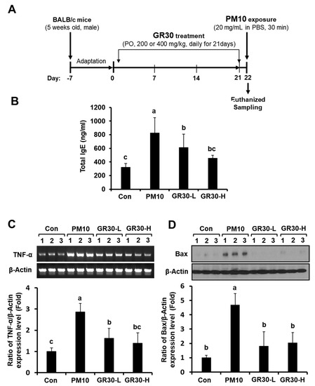 GR30 suppresses PM10-induced serum IgE production and TNF-α and Bax expression in lung tissues. (A) Protocol for animal treatment. Mice were orally administered PBS only (control group, PM10 group), 200 mg/kg/day or 400 mg/kg/day GR30 every day for 21 consecutive days. The mice were exposed to PM10 (20 mg/mL, w/v, in PBS) for 30 min by inhalation using a compressor nebulizer. Effects of GR30 on the levels of (B) serum IgE, (C) TNF-α mRNA expression and (D) Bax protein expression in PM10-challenged mice. The values are expressed as the means ± SD (n = 8), and the means with different letters are significantly different from each other (p < 0.05), as determined by one-way ANOVA followed by Dunnett’s multiple comparison test. Con, untreated normal control group; PM10, PM10-inhaled control group; GR30-L, GR30 (200 mg/kg)-treated group; GR30-H, GR30 (400 mg/kg)-treated group.