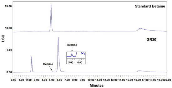 HPLC analysis for betaine in GR30. Betaine in the GR30 preparation was detected and quantified by HPLC system equipped with an ELSD detector. Authentic betaine was used as the reference.