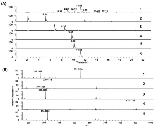 Identification of major anti-inflammatory compounds in GR30 by LC-MS analysis. (A) UHPLC chromatographic separation of compounds in GR30 and extracted ion chromatogram (XIC) of 5 compounds (P1~P5), eluted at RT of 5.14 min (P1), 8.37 (P2), 9.61 (P3), 9.98 (P4), and 11.06 (P5), respectively. (B) MS spectrum of P1~P5 compounds. Compounds were identified as kukoamine A or kukoamine B (P1), 4-[4-(tert-butoxycarbonyl)piperazin-1-yl]benzoic acid (P2), n-caffeoyltyramine (P3), lyciumin A (P4), and coumarin 314 (P5), respectively, based on the high-resolution mass spectrum and MS/MS production ions and summarized in Table 1.