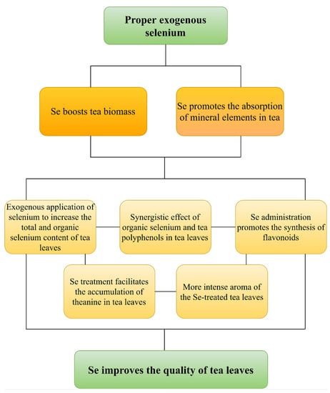 As one of the top three non-alcoholic beverages in the world, tea has received considerable attention from the public for its unique taste and nutritional and health benefits. Studies have shown that long-term tea consumption can reduce serum cholesterol levels and the risk of cardiovascular disease in humans []. The tea tree (Camellia sinensis (L.) O. Kuntze) has a high-selenium enrichment capacity, converting absorbed inorganic Se into organic Se, only about 8% of Se in tea leaves is inorganic, such as selenite, and the rest of Se is organic such as Se-containing proteins and amino acids. Organic Se is safer and more bioavailable than the inorganic one []. The exogenous application of Se can increase the biomass of tea trees while promoting the uptake of mineral elements and inhibiting the uptake of harmful elements. In recent years, numerous studies have shown that exogenous Se fortification can significantly increase the Se content in tea leaves and improve the growth and quality of tea. The review analysis of high-quality articles using the keyword co-occurrence time map [] showed that the related research mainly focuses on the influence of secondary metabolism in tea on human health, such as increasing antioxidant capacity and reducing the risk of cancer and so on (Figure S1A,B), while the mechanism of exogenous selenium on tea growth and nutritional quality is still insufficient.so there is an urgent need to conduct relevant research to further promote the research on quality selenium tea. In this paper, we review the studies on the effects of exogenous Se on the growth and quality of tea trees and provide theoretical support for the selection and development of Se-rich tea trees.