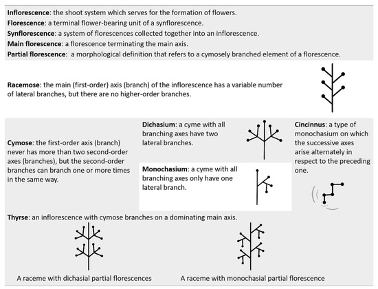 - Endress, P.K. Disentangling confusions in inflorescence morphology: Patterns and diversity of reproductive shoot ramification in angiosperms. J. Syst. Evol. 2010, 48, 225–239. [Google Scholar] [CrossRef]