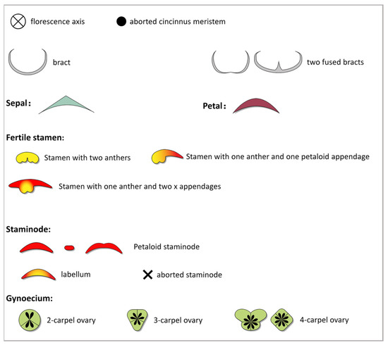 The terminology of Canna inflorescence elements (Figure 1) and floral organs (Figure 2) follows previous literature [5,24,26,27].