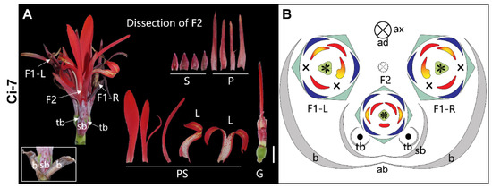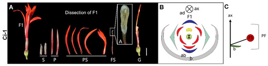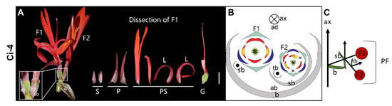 Single flower. (A) Photograph and (B) diagram of the partial inflorescence of Ci-1. (C) Longitudinal scheme of the lateral single flower. Bar = 1 cm.