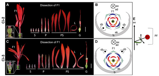 1-flowered cyme. (A) Photograph and (B) diagram of the partial inflorescence of Ci-2. (C) Photograph and (D) diagram of the partial inflorescence in Ci-3. (E) Longitudinal scheme of the 1-flowered cyme. Bars = 1 cm.