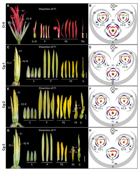 The two lateral secondary flowers in 3-flowered cyme have the same phenotype as normal Canna flowers: they are asymmetric and mirror images of one another (Figure 7B,D,F,H,J,L). In the case of Cg-6, the inner left petaloid staminode in the left secondary flower (F2-L) transforms to a fertile stamen that appears identical to the typical fertile stamen form (Figure 7M,N).