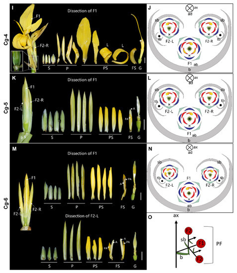 3-flowered cyme. (A) Photograph and (B) diagram of the partial inflorescence of Ci-5. (C) Photograph and (D) diagram of the partial inflorescence of Cg-1. (E) Photograph and (F) diagram of the partial inflorescence of Cg-2. (G) Photograph and (H) diagram of the partial inflorescence of Cg-3. (I) Photograph and (J) diagram of the partial inflorescence of Cg-4. (K) Photograph and (L) diagram of the partial inflorescence of Cg-5. (M) Photograph and (N) diagram of the partial inflorescence of Cg-6. (O) Longitudinal scheme of the 3-flowered cyme. In unopened flowers, the characteristics defining the labellum have not developed, thus the labellum’s position is not indicated in corresponding figures (C–H,K–N). F2-L, the left secondary flower; F2-R, the right secondary flower. Bars = 1 cm.