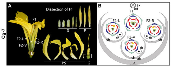 4-flowered cyme (Figure 8)—In accession Cg-7, three secondary flowers (F2-L, F2-R, and F2-V) are produced on the left, right, and abaxial side of the primary flower to form a 4-flowered cyme (Figure 8A). Each of the three secondary flowers has a tertiary bract (tb), indicating that they form a monochasium, although the third order flowers are all aborted (Figure 8B). The primary flower (F1) is zygomorphic with the presence of five sepals, three petals, and six petaloid staminodes among which the outer abaxial one is quite small. The ovary has four locules; the two adaxial locules are larger than the two abaxial locules making the ovary zygomorphic. The style is symmetrical and filamentous. The three secondary flowers of this cyme have the normal (wild type) structure (Figure 8A,B).