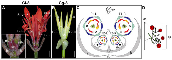 4-flowered thyrse (Figure 11)—In Ci-8 and Cg-8, we observe two opposite cincinni subtended by the two primary bracts leading to a total of four mature flowers; two primary and two secondary (Figure 11A,B). The two primary flowers are affiliated with a single secondary flower each, and each secondary flower is subtended by a secondary bract (Figure 11D). The two secondary bracts are fused in both Ci-8 and Cg-8, and two tertiary bracts are found on the abaxial sides of the two secondary flowers. All the flowers are asymmetric with only a half fertile stamen plus appendage as in normal Canna flowers. The fertile stamen within each flower is located adjacent to the midline (Figure 11C).