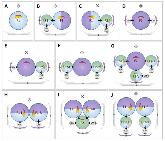 The correlation between the adaxial stamen form and the next order inflorescence branches. (A) Single flower (Ci-1); (B) Sinistrose cincinnus (normal type); (C) Dextrorse cincinnus; (D) 1-flowered cyme (Ci-2 and Ci-3); (E) 2-flowered cyme (Ci-4); (F) 3-flowered cyme (Ci-5); (G) 4-flowered cyme (Cg-7); (H) 2-flowered thyrse (Ci-6); (I) 3-flowered thyrse (Ci-7); (J) 4-flowered thyrse (Ci-8 and Cg-8). Small arrows within a partial inflorescence indicate the developing sequence of the flowers. The half in the primary flower distal to the secondary bract is shaded with purple, and the half in the secondary flower distal to the tertiary bract is shaded with green.