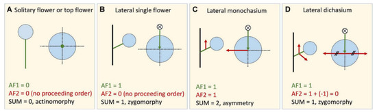 The final symmetry of a flower can be predicted by how the flower is situated in the inflorescence. Floral symmetry is impacted by the position of the flower in the inflorescence when the floral primordium is generated (i.e., influenced by its position relative to the current order) and as it develops (i.e., influenced by its position relative to the next order). Although the genetic or molecular mechanism of this influence on the floral meristem remains unknown, here we generally call it “asymmetry factor” or AF. The potential rule can be simplified as a vector additive operation of the asymmetry factors produced by the preceding order (AF1) and proceeding order (AF2). Because the symmetry of a flower is generally defined from an “en face” view at anthesis [14], only transverse developing direction will contribute to the asymmetry factor to the flower, while vertical developing direction will not influence the floral symmetry. For example, if the current order is a solitary flower or top flower, the floral primordium is produced from a vertical direction; this does not contribute to the asymmetry factor influencing the floral form (Figure 13A) and we define AF1 = 0. For all lateral flowers, AF1 = 1 (Figure 13B–D). AF2 is the asymmetry factor produced by the proceeding order of the flower and is determined by the presence of net direction exerted by the lateral branches. If the proceeding order is one flower, monochasium, or raceme (i.e., there is one transverse net direction; Figure 13C), then AF2 = 1; if the proceeding order is no flower, dichasium or other branching forms that can offset each other on the transverse direction resulting in net direction (Figure 13B,D), AF2 = 0. The overall symmetry of a floral can be predicted by calculating the vector sum of these two asymmetry factors: SUMAF = |AF1 + AF2| (notice that the directions of AF1 and AF2 should be taken into consideration).
