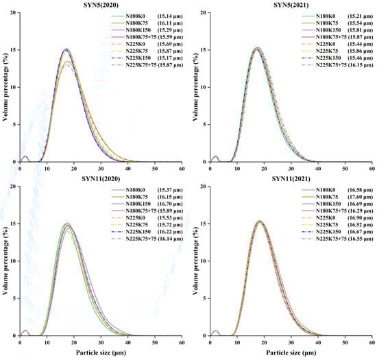 The volume distributions of waxy maize starch granules under different fertilization treatments. N180, N225: application 180 and 225 kg N ha−1; K0, K75 and K150: application 0, 75 and 150 kg K2O ha−1 at sowing date; K75 + 75: application 75 kg K2O ha−1 at sowing date and jointing stage (V6), respectively. Data in the bracket are the mean particle size. The figure shows the mean values of three replicates of the same treatment.