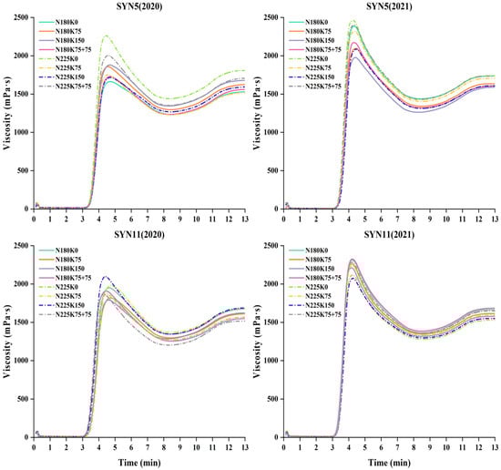 Pasting properties of waxy maize under different fertilization treatments. N180, N225: application 180 and 225 kg N ha−1; K0, K75, K150: application 0, 75 and 150 kg K2O ha−1 at sowing date; K75 + 75: application 75 kg K2O ha−1 at sowing date and jointing stage (V6), respectively. The figure shows the mean values of three replicates of the same treatment.