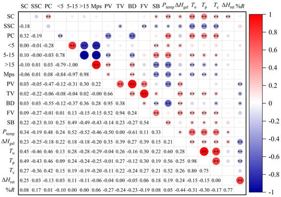 Correlation coefficients of grain quality parameters. SC: starch content; SSC: soluble sugar content; PC: protein content; <5: volume percentage of starch less than 5 μm; 5–15: volume percentage of starch between 5–15 μm; >15: volume percentage of starch more than 15 μm; Mps: mean particle size; PV: peak viscosity; TV: trough viscosity; BD: breakdown viscosity; FV: final viscosity; SB: setback viscosity; Ptemp: pasting temperature; ΔHgel: gelatinization enthalpy; To: onset temperature; Tp: peak gelatinization temperature; Tc: conclusion temperature; ΔHret: retrogradation enthalpy; %R: retrogradation percentage. * and ** represent significance at the 0.05 and 0.01 probability levels.