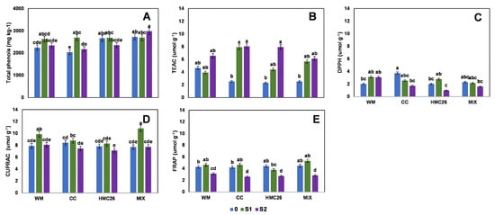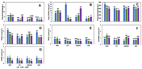 In contrast, in the third harvest, the CUPRAC values increased again in both genotypes. In the VR808 genotype (Figure 5D–G), the CUPRAC levels reached a maximum of 3.7 µmol g−1 in the HMC26 treatment with a stress level of S1, but there were no significant differences between the treatments for this increase. TEAC, DPPH, and FRAP maintained their concentrations in ranges similar to the second harvest, showing a tendency to decrease with increasing stress. In genotype CB2011-104 (Figure 6D,E), CUPRAC had concentrations between 1.9 and 3.4 µmol g−1, with the highest value detected in the MIX treatment. The other methods remained at similar levels compared to the VR808 genotype, since no significant differences were detected between the treatments at the three test levels, but rather they were maintained at the same concentrations.