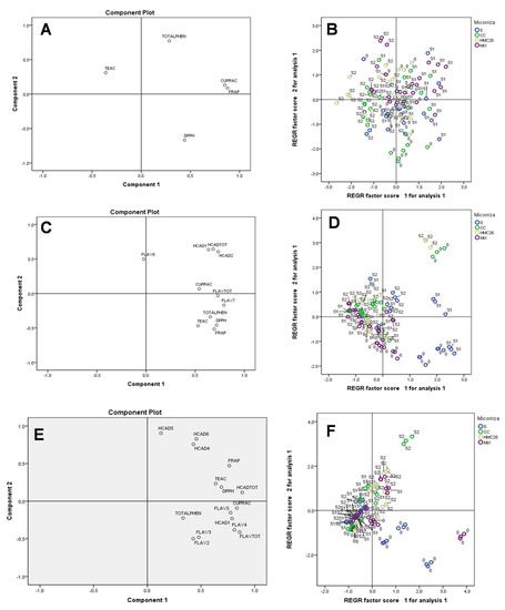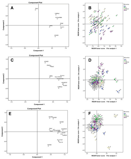 Principal component (PC) scores for the experimental variables (left) determined in Solanum tuberosum leaves and the grouping of the samples according to the distribution of PCs (right), of the genotype CB2011-104. First harvest (A,B), second harvest (C,D), third harvest (E,F). Where: HCAD1, HCAD2, HCAD3: individual hydroxycinnamic acids; FLAV1, FLAV2, FLAV3, FLAV4: individual flavonols; FLAVTOT: total flavanols; HCADTOT: total hydroxycinnamic acids; TOTALPHEN: concentration of total phenolics according to Folin–Ciocalteu method; TEAC: Trolox equivalent antioxidant capacity; CUPRAC: reducing antioxidant capacity of the cupric ion; DPPH: antioxidant activity of the DPPH radical; FRAP:, ferric reducing antioxidant power; 0: without arbuscular mycorrhizal fungi; CC: Claroideoglomus claroideum; HMC26: Claroideoglomus lamellosum; MIX Claroideoglomus claroideum + Claroideoglomus lamellosum; S1 and S2: levels of water stress.