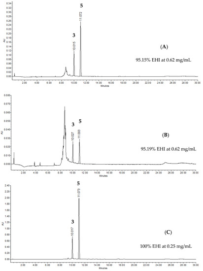 HPLC analysis of Pithecellobium dulce leaves showing egg hatching inhibition of Haemonchus contortus eggs. (A) hydroalcoholic extract (HA-E), (B) aqueous fraction (Aq-F) and (C) organic fraction (EtOAc-F). Coumaric acid (3) and luteolin 7-O-rhamnoside (5).