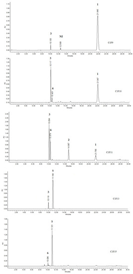 Figure 2 shows the chemical constituents present in the bioactive subfractions. The major compounds identified in C1F9 were kaempferol (1) with a retention time (rt) of 21.8 min (75.87%) and a UV absorption spectrum at λmax of 209.9, 265, and 363 nm; a compound derived from caffeic acid (unidentified) of 12.5 min (2.29%) and a UV absorption spectrum at λmax of 219.2, 242.7, and 325.5 nm; and coumaric acid (3, rt= 10.01, 21.84%). The C1F10 subfraction showed the presence of (1, rt = 21.94, 25.96%), ferulic acid (4, rt = 10.4 min, 4.39%) and UV absorption spectrum λmax of 218.1, 234.5, and 320.8 nm and (3, rt = 10.01 min, 69.65%). In subfraction C1F11, the presence of kaempferol (1, rt = 21.94, 8.47%), quercetin (2, rt = 14.96 min, 8.79%), (4, rt = 10.4 min, 19.75%), and (3, rt = 10.1 min, 62.99%) were observed. The subfraction C1F13 contained luteolin 7-O-rhamnoside (5, rt = 11.1 min, 90.02%) and coumaric acid (3, rt = 10.1 min, 9.98%), while subfraction C1F15 contained luteolin 7-O-rhamnoside (5, rt = 11.1 min, 93.05%) and quercetin 3-O-rhamnoside (6, rt = 10.03 min, 6.95%). Fingerprint comparison of the bioactive fractions with commercial references (kaempferol, quercetin, coumaric acid, ferulic acid, and quercetin 3-O-rhamnoside) allowed identification of these polyphenols (Figures S6–S10).