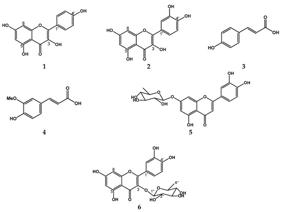 Compound (1): analysis of the acquired NMR spectra [1H, 13C, and DEPT (Figures S1–S3)] and its comparison to data reported in the literature [21], this compound is a flavonoid known as Kaempferol (1). Compound 1 displayed a quasimolecular positive ion at m/z 287 [M + H]+ in ESI-MS (Figure S4), with molecular formula C15H10O6.