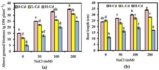 Aboveground biomass (g DW plant−1) and root length (cm) (a,b) of Salicornia fruticosa exposed to nutrient solution containing 0, 25, and 50 μg L−1 Cd (0-Cd, L-Cd, and H-Cd, respectively) without or with 50, 100, and 200 mM NaCl. Each value is the average of four replicates ± SE. Values bearing different letters are significantly different at p < 0.05 based on Tukey’s test. DW: dry weight.