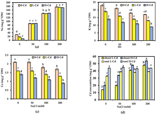 Concentrations in mg g−1 DW of leaf sodium (Na), potassium (K), calcium (Ca), and shoot and root cadmium (Cd) (a,b,c,d, respectively) in Salicornia fruticosa exposed to nutrient solution containing 0, 25, and 50 μg L−1 Cd (0-Cd, L.-Cd, and H.-Cd, respectively) without or with 50, 100, and 200 mM NaCl. Each value is the average of four replicates ± SE. For shoot and root Cd concentration, values of 0-Cd were removed from (d), as no Cd was detected in 0-Cd treatment. Values bearing different letters are significantly different at p < 0.05 based on Tukey’s test. DW: dry weight.