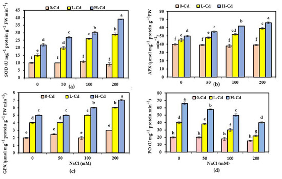 The activities of superoxide dismutase (SOD), glutathione peroxidase (GPX), ascorbate peroxidase (APX), and peroxidases (POs), along with an elevation in external Cd concentration (Figure 3a–c), were substantially improved. However, elevated supplementation of NaCl showed no change in their pattern, compared to NaCl-untreated plants, during the 17-day period of experimentation. Further increase in the enzymes’ activity was recorded for combined salinity and Cd-stressed plants. In contrast to SOD, APX, and GPX, peroxidase (PO) activity was reduced significantly by NaCl and Cd co-occurrence, in accordance with the highest PO activity for treatments of Cd alone, and minimized PO activity in salinized plants, for the former (Figure 3d).