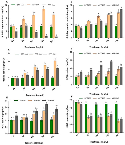 Effect of IAA on the (A) soluble sugar content, (B) soluble protein content, (C) proline content, (D) SOD activity, (E) POD content, and (F) MDA content of N. tangutorum. The values represent the mean of three replicates determinations. The error bars represent standard deviations. Bars with the same letter are not significantly (p > 0.05) different.