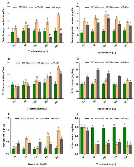 Effect of ABA on the (A) soluble sugar content, (B) soluble protein content, (C) proline content, (D) SOD content, (E) POD content, and (F) MDA content of N. tangutorum. The values represent the mean of three replicates determinations. The error bars represent standard deviations. Bars with the same letter are not significantly (p > 0.05) different.