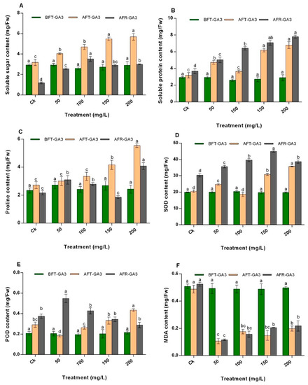 Effect of GA3 on the (A) soluble sugar content, (B) soluble protein content, (C) proline content, (D) SOD content, (E) POD content, and (F) MDA content of N. tangutorum. The values represent the mean of three replicates determinations. The error bars represent standard deviations. Bars with the same letter are not significantly (p > 0.05) different.