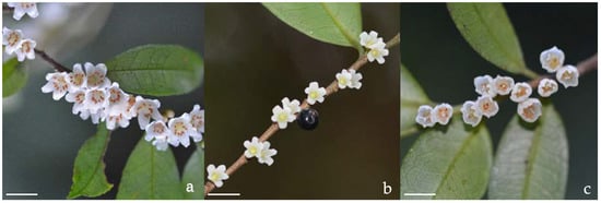 Flowering branches of Eurya loquaiana from male (a), female (b), and hermaphrodite (c) plants. The scale bars are 5 mm.