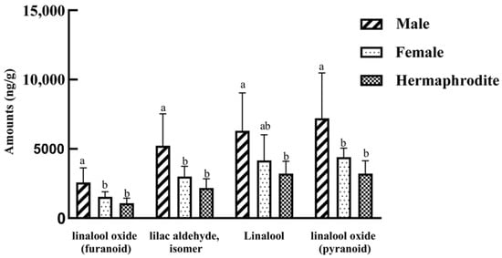 Although the same compounds were detected in all sex types, their compositions varied (Table 2). The female floral scent contained a greater proportion of terpenoids (86.9%) than the male (81.9%) and hermaphrodite (79.0%) floral scents. Aliphatic hydrocarbons accounted for 19.6% of the compounds identified in the hermaphrodite floral scent, which is greater than in the male (16.0%) and the female (11.6%) floral scents. Regarding the four most abundant compounds, females contained a significantly higher percentage of linalool oxide (pyranoid) than hermaphrodites; females and males contained a significantly higher percentage of lilac aldehyde and linalool oxide (furanoid) than hermaphrodites; the three sex types contained equivalent amounts of linalool (Table 2). The contents of the four main substances were estimated using 2-methyl-3-heptanone as an internal standard, and the highest content all appeared in male flowers (Figure 2).
