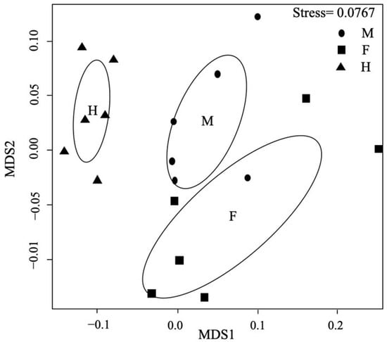 Nonmetric multidimensional scaling (NMDS) of Eurya loquaiana floral scent composition. Male (M), female (F), and hermaphrodite (H) flowers were tested.