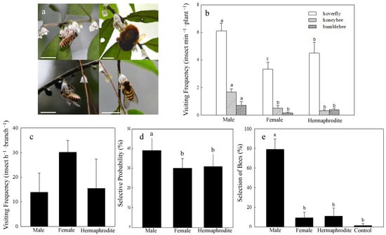 Main visitors of Eurya loquaiana (a) and their responses to different sexual types (b–e). (a) Honeybee (left), bumblebee (top right), and hoverfly (lower right), the scale bars are 10 mm. (b) Visiting frequency of the main visitors in the wild. (c) Visiting frequency in the controlled experiment. (d) The selective probability of visitors in the controlled experiment. (e) Honeybee responses to the floral scent. Different lower-case letters (a–c) above the bars indicate significant differences among sexes or treatments (p < 0.05).