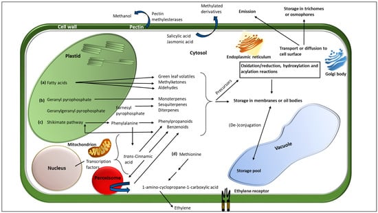 Biosynthetic sites, storage, and transport of major plant volatile organic compounds. The four major biosynthetic classes, (a) fatty acids, (b) terpenoids, (c) benzenoids, and (d) amino acids, are represented in the figure. Modification reactions including redox reactions, hydroxylation, acylation, and degradative reactions occur mainly in the cell cytosol. Some reactions may also occur in the membrane-bound sub-cellular compartments such as plastids, mitochondria, and endoplasmic reticulum. Inactive forms of the VOCs such as glycosides are stored in the vacuole, ducts, and other extracellular compartments such as trichomes. Transport of the volatiles is by passive diffusion and possibly via vesicular trafficking by the endoplasmic reticulum, golgi apparatus, and the trans-golgi network. (Modified from Pichersky et al. [51]).