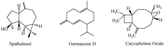 The EO analyses of A. pyrethrum collected from the Ben Slimane region showed the presence of 32 compounds representing about 92.67% of the total chemical composition. The oxidative sesquiterpenes constitute the abundant group of all identified compounds (58.96%), followed by hydrocarbon sesquiterpines (24.19%). The main compounds are: spathulenol (20.47%), germacrene-D (16.48%), caryophylleneoxide (13.20%), 4-(14)-salvial-1-one (8.27%), caryophyllene-4(14) and 8(15)-diene5α-ol (7.30%) (Figure 2) [7]. The study of A. pyrethrum from Timahdit, Morocco, revealed the presence of 42 compounds for the sample collected before flowering and 36 compounds for the sample collected after flowering. These compounds represent 91.32% and 91.82%, respectively, of the total of these essential oils. The oxygenated sesquiterpenes constitute the most abundant group among the identified compounds. Its rate ranges from 89.17% (before flowering) to 90.58% (after flowering), during the maturity stage [27]. Similarly, this group is the most abundant Algerian species, as demonstrated in [28]. In this study, the proportion of sesquiterpenes ranged between 37.1% and 58.6% before and after the flowering, respectively [28].