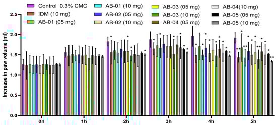 Acute inflammation was incited by the injection of 0.1 mL of 1% freshly prepared suspension of carrageenan in normal saline into the sub-plantar region of the right hind paw of all groups of animals. At 1, 2, 3, 4, and 5 h intervals, the volume of the injected paws was measured using a plethysmometer. The animals were premedicated with the vehicle (0.3% CMC p.o.), isolated compounds AB-01, AB-02, AB-03, AB-04 and AB-05 at doses 05 and 10 mg/kg, and the standard drug indomethacin (10 mg/kg) 1 h before the carrageenan challenge [28]. The percentage inhibition of inflammation was intended to be consistent with the following formula: % inhibition = 100 (1 − Vt/Vc), where ‘Vc’ stands for the inflammation volume in the control and ‘Vt’ for the inflammation volume in the group treated with tested drugs.