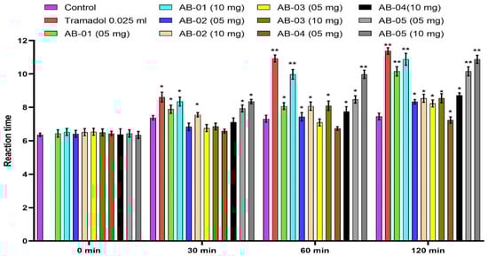 AB-01 and AB-05 at a dose of 10 mg/kg and Tramadol significantly (p < 0.01) augmented the response time of the animals towards the thermal source at various periods (Figure 2). The hot plate test of isolated compounds AB-01, AB-02, AB-03, AB-04 and AB-05 (at dose 10 mg/kg p.o.) and Tramadol (10 mg/kg. s.c) displayed a pain inhibition percentage (PIP) of 71.45%, 36.78%, 66.73%, 44.93%, 74.79% and 79.21%.