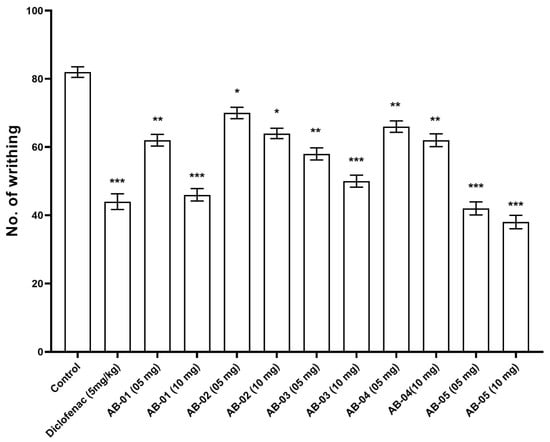 The animals were pre-medicated with the vehicle (0.3% CMC p.o.), AB-01, AB-02, AB-03, AB-04 and AB-05 at doses 05 and 10 mg/kg, and the standard medication diclofenac (5 mg/kg). Acetic acid (1% v/v) in doses of 1 mL/kg body weight was injected intra-peritoneally in all the groups of animals 1 h after dosing of the test and standard drugs. Writhing was recorded by counting the number of writhes following the injection of acetic acid for a time of 30 min. A writhe was identified as hind limb abdominal constriction and full extension [29].