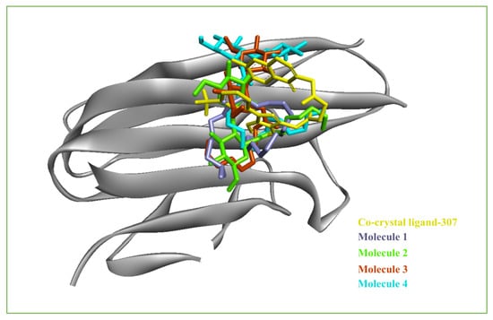 Superimposed conformations of the docked molecules and co-crystal ligand- 307 in the binding pocket of 2AZ5_A. The docked molecules are shown in the sticks, and the protein is shown in cartoon representation using Biovia Discovery Studio Visualizer.