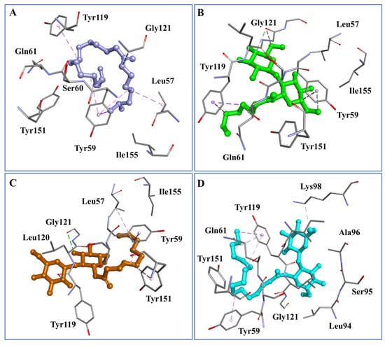 Docked complexes of Molecule 1 (A), Molecule 2 (B), Molecule 3 (C), and Molecule 4 (D) in the binding pocket of TNF-alpha (PDB ID: 2AZ5_A). The interacting residues of the protein are shown in the stick view, whereas molecules 1–4 are shown in the ball and stick. The images were drawn in Biovia Discovery Studio Visualizer.