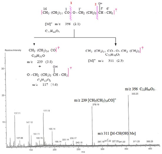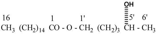 Compound AB-01, Eluants from chloroform: methanol (19:1), a colorless fatty acid ester called AB-01, was produced. Its IR spectra (Figure S1) showed absorption bands for the hydroxyl group (3410 cm−1) and the ester function (1722 cm−1). The mass spectrum (Figure S2) at m/z 356, displayed a molecular ion peak, identical to a fatty acid ester’s chemical formula, C22H44O3. Hexadiol was used to esterify palmitic acid, as evidenced by the ion signal at m/z 239 [CH3(CH2)14CO]+ and 117 [M-239]+. One hydroxyl group present at C-5′ (Figure 6) was supported by the ion fragment produced at m/z 311 [M-CH(OH) Me]. Compound 1 1H NMR spectrum (Supplementary Materials) (Figure S3) showed a one-proton broad multiplet at δ 3.64 with a half-width of 11.2 Hz attributed to the proton of β-oriented H-5′ carbinol. Two triplets of δ 3.50 (J = 7.2 Hz) and 2.56 (J = 7.5 Hz), each integrating for two protons, produced oxygenated methylene H2-1′ and methylene H2-2 next to the ester carbon, respectively. The remaining methylene protons showed up as a broad singlet at δ 1.28 (28H) and multiplets at 1δ 1.55 (2H) and 1.32 (4H). A six-proton multiplet accounted for the terminal C-16 and C-6′ methyl protons at a value of 0.88. Compound AB-01’s 13C NMR spectra (Figure S4) showed indications for ester carbon at δ 173.41 (C-1), carbinol carbon at δ 73.90 (C-5′), Methylene carbons at δ 64.39 (C-1′), δ 38.32 to 22.48 (all oxygenated), and δ 18.61 (C-1′) and 14.21 (both oxygenated) (C-14). These arguments led to the formulation of compound AB-01’s chemical structure as 5′-hydroxyhexyl n-hexadecanoate (Scheme 1). It was identified as a label aliphatic ester.