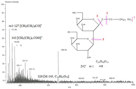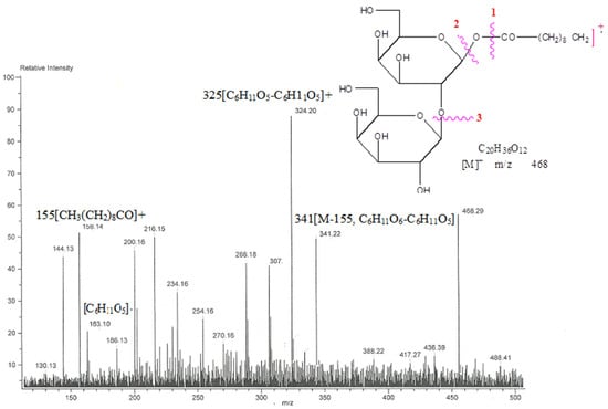 From chloroform: methanol (19:1) eluants, the crystalline mass of chemical AB-02 capryloyl diglucoside was synthesized. It demonstrated IR absorption bands (Figure S5) for hydroxyl groups (3450, 3389, 3265 cm−1), ester function (1721 cm−1), and aliphatic chain (779 cm−1) and produced a positive Fehling solution for glucoside. The molecular ion peak of chemical AB-02 (Figure S6) was identified at m/z 468 based on mass and 13C NMR spectra, which is compatible with the molecular formula of acyl diglycoside, C20H36O12. The ion peaks arising at m/z 127 [CH3(CH2)6CO] + and 143 [CH3(CH2)6 COO]+ indicated that aglycone capric acid was esterified with the diglycosidic glycone unit. The ion fragments generating at m/z 163 [C6H11O5]+ and 326 [M-143, C12H21O10] suggested that the aglycone unit was connected to the C12 sugar unit (Figure 7). Compound 2 1H NMR spectra (Figure S7) revealed two one-proton doublets at δ 4.04 (J = 7.2 Hz) and 3.99 (J = 7.1 Hz), which were attributed to the anomeric protons 1 + -1′ and H-1′′, respectively. Between δ 3.83–3.10, the other sugar protons made an appearance. Methylene H2-2 near the ester function was found to have a two-proton triplet at around δ 2.56 (J = 7.2 Hz). The acyl unit’s methylene protons were responsible for a broad singlet at δ 1.29 and a two-proton multiplet at δ 1.39 (8H). The terminal C-8 primary methyl protons were attributed to a three-proton triplet at about δ 0.88 (J = 6.3 Hz). Compound 2’s 13C NMR spectra (Figure S8) showed signals for methyl carbon at 14.21δ 14.21(C-8), ester carbon at δ 172.06 (C-1), and anomeric carbons at δ 103.29 (C-1′) and 99.33 (C-1′′), as well as additional sugar carbons between δ 34.82 and 22.63. The saturated nature of the molecule was corroborated by the lack of any signal in the 1H NMR spectrum above δ 4.04 and the 13C NMR spectrum between δ 172.06 and 130.29. The second sugar unit may have been located at C-2′, as suggested by the presence of C-2′ in the deshielded area at δ 83.41 in the 13C NMR spectra. Capric acid D-glucose was produced via the compound AB-02’s acid hydrolysis (TLC comparable). The structure of component AB-02 was determined as n-octanoyl-β-D-glucopyranosyl-2′-β-D-glucopyranoside (Scheme 2) based on these proofs.