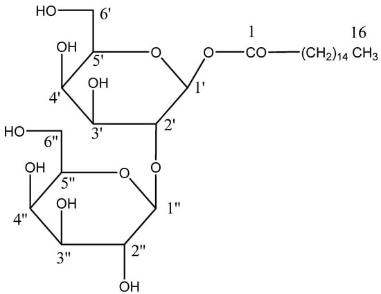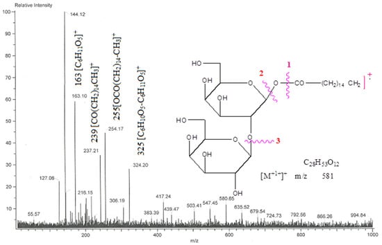 Chloroform and methanol (9:1) eluants were used to separate compound AB-04, palmityl diglucoside, a colorless crystalline mass. After carrying out a Fehling solution test, glycosides were revealed to be present, as well as IR absorption bands (Figure S13) for hydroxyl (3448, 3356, 3251 cm−1), ester (1725 cm−1), and aliphatic chain (779 cm−1). According to its molecular formula C28H53O12, compound AB-04’s molecular ion peak was discovered at m/z 581[M+H], based on mass (Figure S14) and 13C NMR spectra. The ion peaks appearing at m/z 239 [CO(CH2)14CH3]+, 255[OCO(CH2)14-CH3]+, 325 [C6H10O5-C6H11O5]+ and 163 [C6H11O5]+ showed that the diglycoside unit had a palmityl chain connected to it (Figure 9). Two one-proton doublets at δ 4.04 (J = 7.2 Hz) and 4.01 (J = 7.0 Hz) in compound AB 04 1H NMR spectra (Figure S15) were attributed to anomeric H-1′ and H-1′′ protons, respectively, with an additional sugar proton from δ 3.96 to 3.30, and a two-proton triplet at δ 2.31 (J = 7.2 Hz) attributable to the methylene H2-2 proton next to the ester group. Additional methylene protons, including a two-proton multiplet at δ 1.62, a singlet at δ 1.29 (24H), and three proton triplets at δ 0.88 (J = 6.2 Hz), were responsible for the C-16 main methyl protons. Signals for ester carbons at 171.52 (C-1), anomeric carbons at 103.27 (C-1) and 93.32 (C-1), other sugar carbons within δ 83.39 to 62.90, methylene carbons from δ 33.88 to δ 22.55, and methyl carbon at δ 14.61 were seen in compound AB 04 13C NMR spectra (C-16). The attachment of the second sugar unit at C-2′ was suggested by the existence of the C-2′ carbon signal in the deshielded area at δ 83.39. No signal was seen after δ 4.04 in the 1H NMR spectrum or from δ 171.52 to 103.27 in the 13C NMR spectrum (Figure S16), indicating that the molecule was already saturated. Compound AB-04 acid hydrolysis generated palmitic acid and glucose, which were equivalent when analyzed using thin-layer chromatography (TLC). Based on this evidence, the chemical structure of compound 4 was determined as n-hexadecanoyl-(2′→1′′)-β-D-glucopyranosyl-β-D-glucopyranoside (Scheme 4).