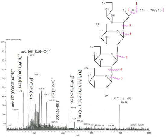 The diagnostic MS/MS fragmentation at m/z 792 full ESI-MS scan of the isolated compound n-deconoyl-β-D-glucopyranoryl-(2′→1′′)-β-D-glucopyranoside.