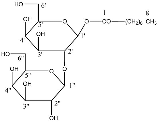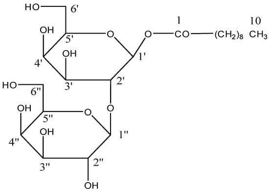 The column was then eluted using a mixture of methanol and chloroform (1:19) that yielded a colorless mass of AB-02. This was recrystallised with methanol, and a 103 mg mass of 0.11% yield was obtained. UV λmax (MeOH): 210 nm; Rf 0.42 (MeOH: CHCl3-1:19); m.p. 115–118 °C; (KBr) IR νmax: 779, 867, 1059, 1231, 1403, 1721, 2852, 2936, 3265, 3389, 3450 cm−1. 1H NMR (MeOD)- 0.88 (3H, t, J = 6.3 Hz, Me-8); 1.29 (8H, brs,4 × CH2), 1.39 (2H, m, CH2), 2.56 (2H, t, J = 7.2 Hz, H2-2), 3.10 (2H, brs, H2-6′′), 3.34 (2H, brs, H2-6′), 3.48(1H, m, H-4′′), 3.57 (1H, m, H-4′), 3.64 (1H, m, H-3′′), 3.67 (1H, m, H-3′), 3.70 (1H, m, H-2′′), 3.74 (1H, m, H-5′′), 3.78 (1H, m, H-5′), 3.83 (1H, m, H-2′), 3.99 (1H, d, J = 7.1 Hz, H-1′′), 4.04 (1H, d, J = 7.2 Hz, H-1′). 13C NMR (MeOD): 14.21(ME-8); 22.63 (CH2), 30.12 (4 × CH2), 34.82 (CH2), 62.74 (C-6′′), 64.55 (C-6′), 66.04 (C-4′′), 69.53 (C-4′), 71.39 (C-3′′),71.97 (C-3′), 71.97 (C-3′), 73.99 (C-2′′), 76.92(C-5′′), 77.64 (C-5′), 83.41(C-2′), 99.33(C-1′′), 103.29 (C-1′), 172.06 (C-1). +ESI MS m/z (rel.int): 468[M]+ (C20H36O12), 326 (12.5), (5.3), 163 (47.8), 127 (100), 143 (32.1).
