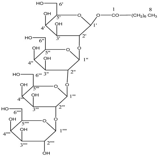 Column elution with methanol: chloroform in a ratio of (1:9) gave a crystalline mass of a light brown color AB-05, which was recrystallised again from methanol that yielded a 145 mg mass of 0.23% yield. The Rf 0.63 (CHCl3-MeOH, 9:1) and m.p. was found to be 125–126 °C. UV λmax (MeOH) ranged at 206 nm. The KBr- IR νmax values were 779, 1059, 1240, 1402, 1639, 1723, 2931, 3265, 3397, 3425 cm−1. 1H NMR (MeOD): δ 0.86 (3H, t, J = 6.3 Hz, Me-8); 1.25 (8H, brs, 4 × CH2), 1.52 (2H, m, CH2), 2.51 (2H, m, H2-2), 3.29 (2H, d, J = 6.1 Hz, H2-6′′′′), 3.31 (4H, d, J = 6.5 Hz, H2-6′′, H2-6′′′), 3.34 (2H, d, J = 6.2 Hz, H2-6′), 3.46 (1H, m, H-4′′′′), 3.48 (1H, m, H-4′′′), 3.52 (1H, m, H-4′′), 3.57 (1H, m, H-4′), 3.61 (1H, m, H-3′′′′), 3.64 (1H, m, H-3′′′), 3.69 (1H, m, H-3′′), 3.78 (1H, m, H-3′), 3.78 (1H, m, H-2′′′′), 3.82 (2H, m, H-5′′′, H-5′′′′), 3.84 (2H, m, H-5′, H-5′′), 3.87 (1H, m, H-2′′′), 3.93 (1H, H-2′′), 3.96 (1H, m, H-2′), 4.00 (1H, d, J = 7.3 Hz, 1 + -1′′′′), 4.02 (1H, d, J = 7.0 Hz, H-1′′′), 4.04 (1H, d, J = 7.2 Hz, H-1′′), 4.06 (1H, d, J = 7.1 Hz, H-1′). 13C NMR (MeOD): δ 14.27 (Me-8), 22.48 (CH2), 29.86 (4 × CH2), 33.13 (CH2), 62.62 (C-6′′′′), 62.63 (C-6′′′), 62.65 (C-6′′), 63.81 (C-6′), 64.62 (C-4′′′′), 65.13 (C-4′′′), 65.90 (C-4′′), 69.41 (C-4′), 71.28 (C-3′′′′), 71.87 (C-3′′′), 73.04 (C-3′′), 73.84 (C-3′), 74.89 (C-2′′′), 76.31 (C-5′′′′), 76.74 (C-5′′′), 77.51 (C-5′′), 77.99 (C-5′), 83.18 (C-2′′, C-2), 84.24 (C-2′), 98.16 (C-1′′′′), 99.33 (C-1′′′), 103.20 (C1′′), 105.89 ((C-1′), 171.13 (C-1). +ve ESI MS m/z (rel.int): 792[M]+ (C32H56O22) (6.2), 629 (7.0), 503 (14.8), 487 (6.2), 467(4.3), 305 (15.1), 289 (6.7), 179 (13.6), 163 (9.2), 143 (100), 127 (24.3).