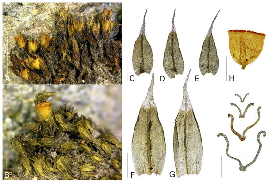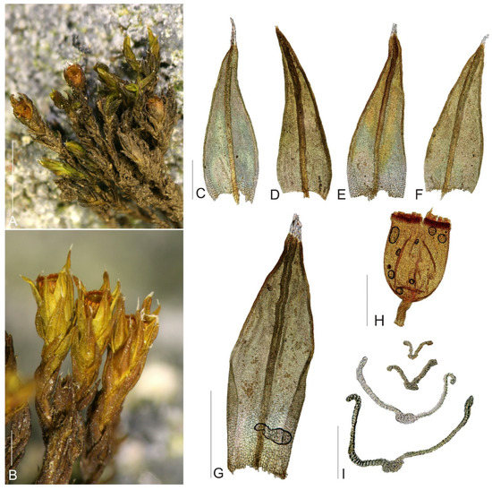 Macro and micro photographs of Schistidium flaccidum: (A,B) view on fertile plants; (C–E) leaves; (F,G) perichaetial leaves; (H) capsule; (I) leaf cross-sections (from the base of the leaf to the tip). Scale bars: (A,B)—1 mm, (C–H)—0.5 mm, (I)—0.1 mm. All photos from specimen OSTR #7250, made by V. Plášek.