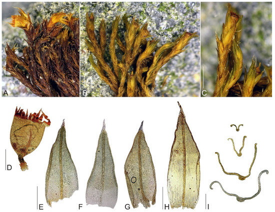 Macro and micro photographs of Schistidium pulchrum: (A–C) view on fertile plants; (D)—capsule; (E–G) leaves; (H) perichaetial leaf; (I) leaf cross-sections (from the base of the leaf to the tip). Scale bars: (A–C)—1 mm, (D–H)—0.5 mm, (I)—0.1 mm. All photos from specimen OSTR #7252, made by V. Plášek.