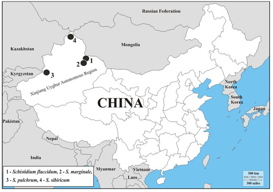 Schistidium sibiricum has mainly Asian distribution with few localities in the Ural Mountains, Kola Peninsula, south Finland and northern Norway. In Asia, it is a frequent species in the mountains of south Siberia and the southern part of the Russian Far East with several records from Kamchatka [7,19,26].