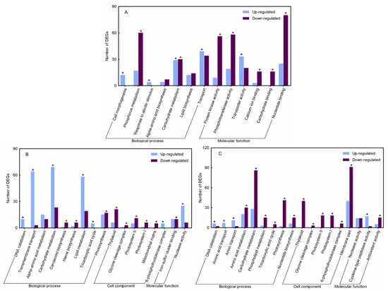 Enrichment analysis of GO terms in three sequential periods. (A) 0–15 DAA. (B) 15–25 DAA. (C) 25–30 DAA. “*”: Significantly enriched GO terms, p < 0.05.