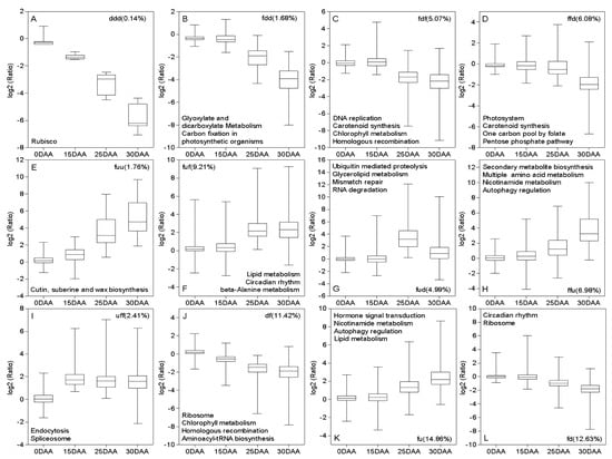Classification of DEGs based on their expression dynamics. Only 12 groups (A–L) with enriched KEGG pathways are shown. “f” refers to the flat expression; “d” and “u” represent significant down- and up-regulation, respectively. The number in parentheses is the percentage of DEGs in each class. (A–I) three letters, for example, “ddd” indicate down-regulation at 0–15 DAA, 15–25 DAA and 25–30 DAA. (J) “df” indicates DEGs with downregulation expressions at 0–25 DAA and flat expressions at 25–30 DAA. (K,L) “fu” and “fd” indicate DEGs with flat expressions at 0–15 DAA and differential expressions at 15–30 DAA. The median (horizontal lines), 25th and 75th percentiles (boxes), and expression ranges (whiskers) are shown for each group.
